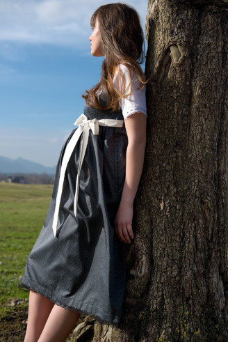 Das Salzburger Label PLOOM produziert nicht nur modisch-authentische Trachtendirndl, sondern auch entzückende Umstandsdirndl. Diese Dirndl für die Schwangerschaft zeichnen sich aus durch einen hohen Tragekomfort bedingt durch den Empireschnitt (das Oberteil ist unterhalb der Brust abgeschnitten). Der Rock ist gereiht angesetzt und an Stelle der Schürze wird unterhalb der Brust eine Schleife in einer Kontrastfarbe gebunden (eine Schürze würde zu sehr auftragen). Den Ausschnitt ziert eine Logo Libelle. In der Seitennaht sind 3 cm Einschlag, das Umstandsdirndl kann also bis zu zwei Größen erweitert werden! Der Rock ist weit genug, sodass das Dirndl auf jeden Fall bis zum Ende der Schwangerschaft getragen werden kann.